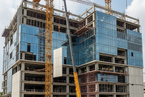 A multi-storey commercial hub with precast facades and PEB structures, blending elegance and strength.